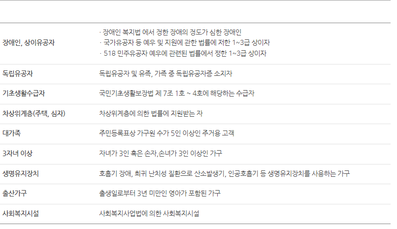 지원 대상은 한전 전기요금 복지할인 대상이면 누구나 가능하다. 복지할인 가구는 저소득층(기초생활보장 수급자, 차상위계층), 장애인, 유공자, 세 자녀 이상 가구, 대가족, 출산 가구이다. 특히 출산 가구는 출생일로부터 3년 미만인 영아가 포함된 가구를 의미하며, 소득분위, 나이와 상관없이 혜택을 받을 수 있다.